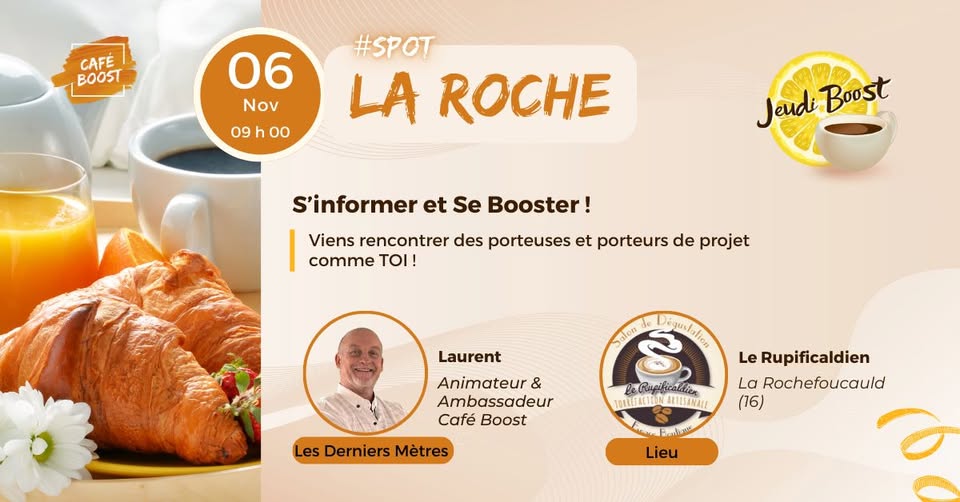 Les ApéroBoost laissent place aux JeudiBoost : des rencontres matinales entre entrepreneurs, pour échanger, s'entraider et repartir boosté.e pour la journée.